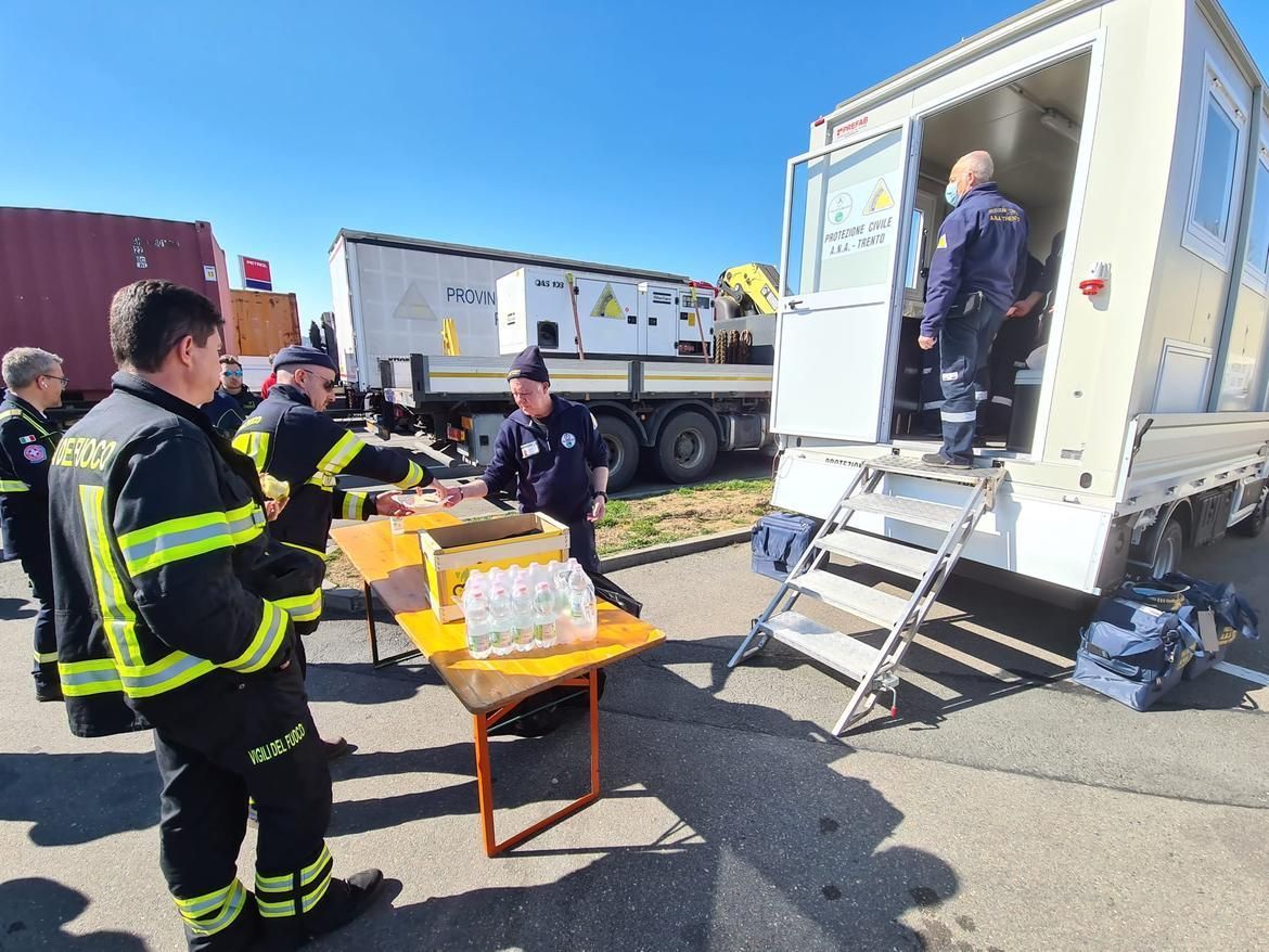 Dopo aver attraversato due confini di Stato (Slovenia e Ungheria), la colonna mobile della Protezione civile trentina e altoatesina raggiungerà in serata (21/3/2022) Budapest, per la prima notte della spedizione in territorio straniero. Il viaggio che porterà fino in Moldavia i 43 uomini guidati dal capo missione Giovanni Giovannini, è iniziato alle 5 del mattino, al termine del briefing presso il polo della Protezione civile a Lavis. La colonna di 11 tir - accompagnata da alcuni mezzi di supporto e da un’ambulanza - con 18 container di materiale per l’allestimento di un campo di accoglienza per le persone in fuga dal conflitto in Ucraina, ha percorso la lingua di asfalto che costeggia campi e piccoli centri abitati ed a tratti si immerge nella foresta. L’autostrada viene percorsa da decine di mezzi carichi di beni destinati alla popolazione ucraina e ai territori che confinano con il Paese devastato dai bombardamenti. Riconoscere gli autisti in “missione” non è troppo difficile: spesso sulla cabina campeggia la bandiera gialloblu dell’Ucraina in segno di vicinanza. E così nascono incontri nel segno della solidarietà. È accaduto anche durante la sosta per il pranzo, quando un gruppo di 12 vigili del fuoco francesi appartenenti all’associazione umanitaria ‘Aaip’ ha srotolato uno striscione, invitando i membri della spedizione regionale ad unirsi per una foto ricordo. Non poteva mancare la bandiera del Trentino. I pompieri provenivano dalla Corsica ed hanno fatto scalo a Lione. Consegneranno generi di prima necessità al confine tra Ungheria e Ucraina.